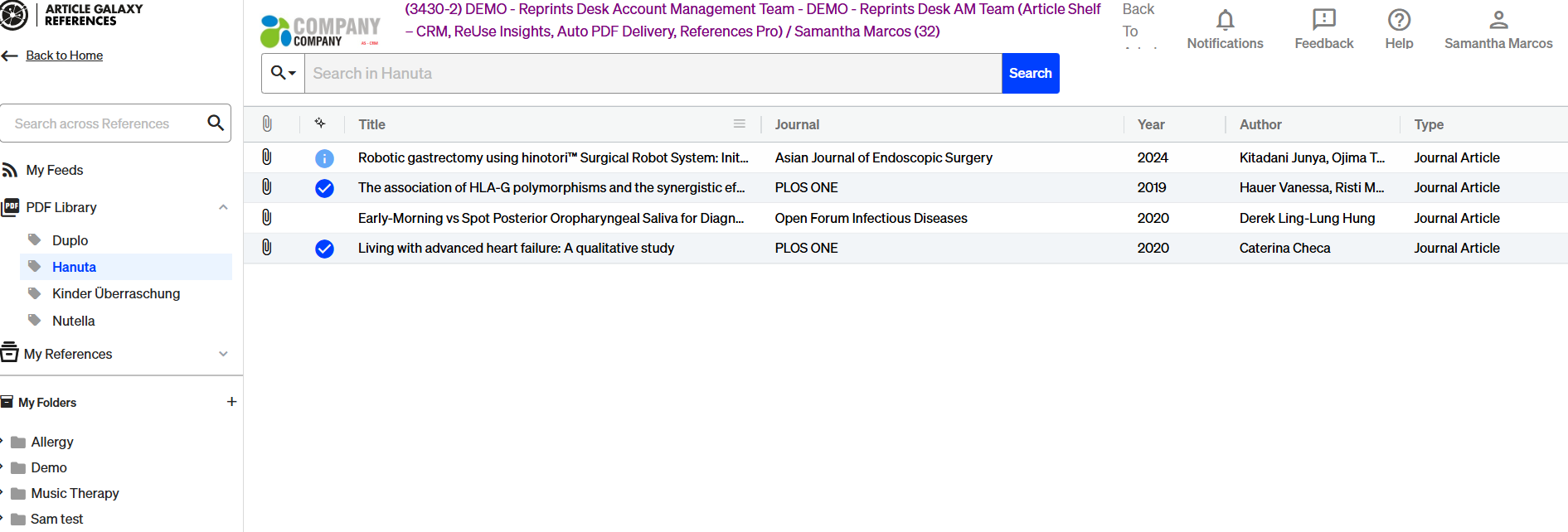 When an order has been completed, it will populate the PDF Library and the tags assigned will organize the identified articles into unique views within References.